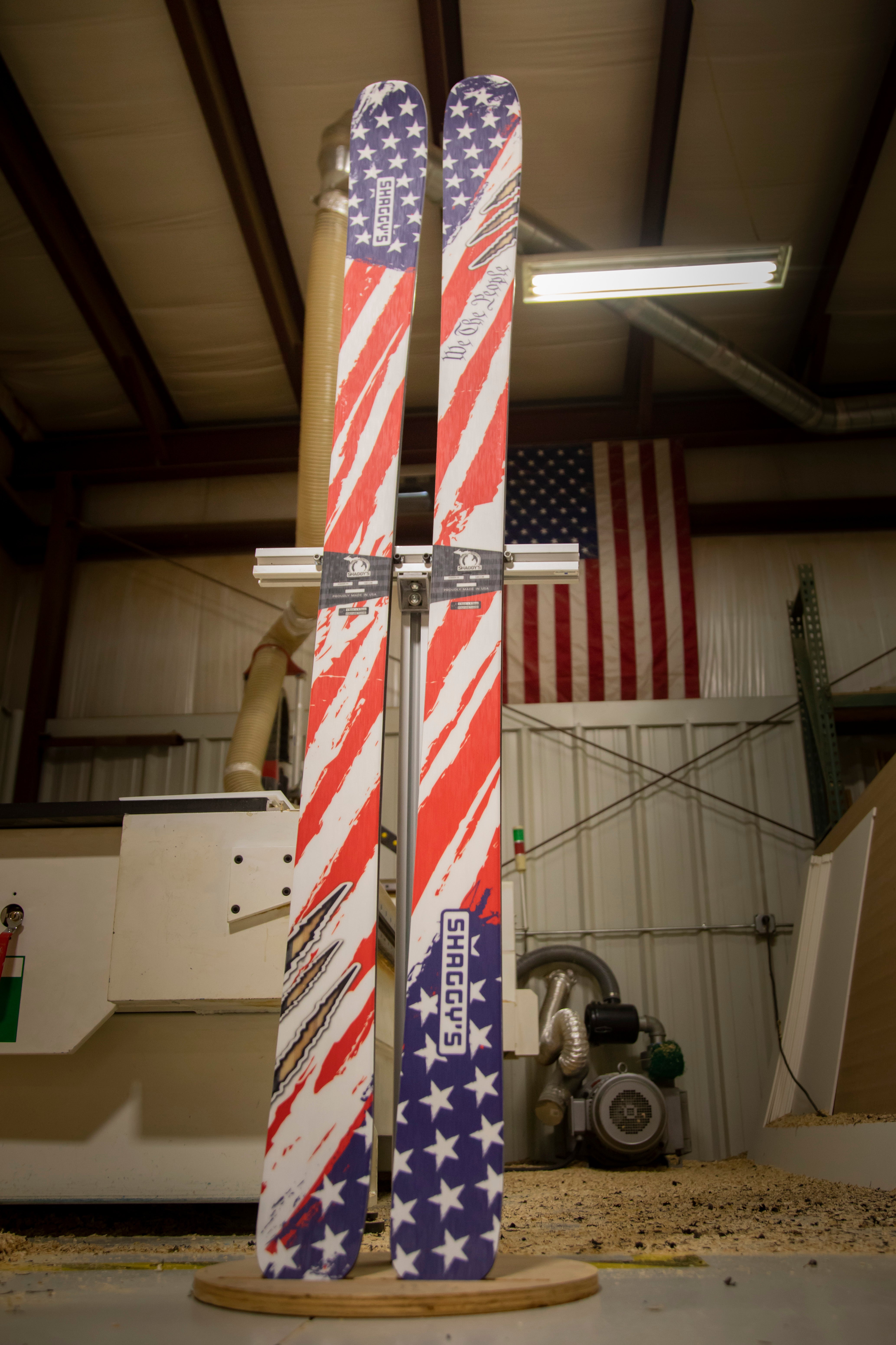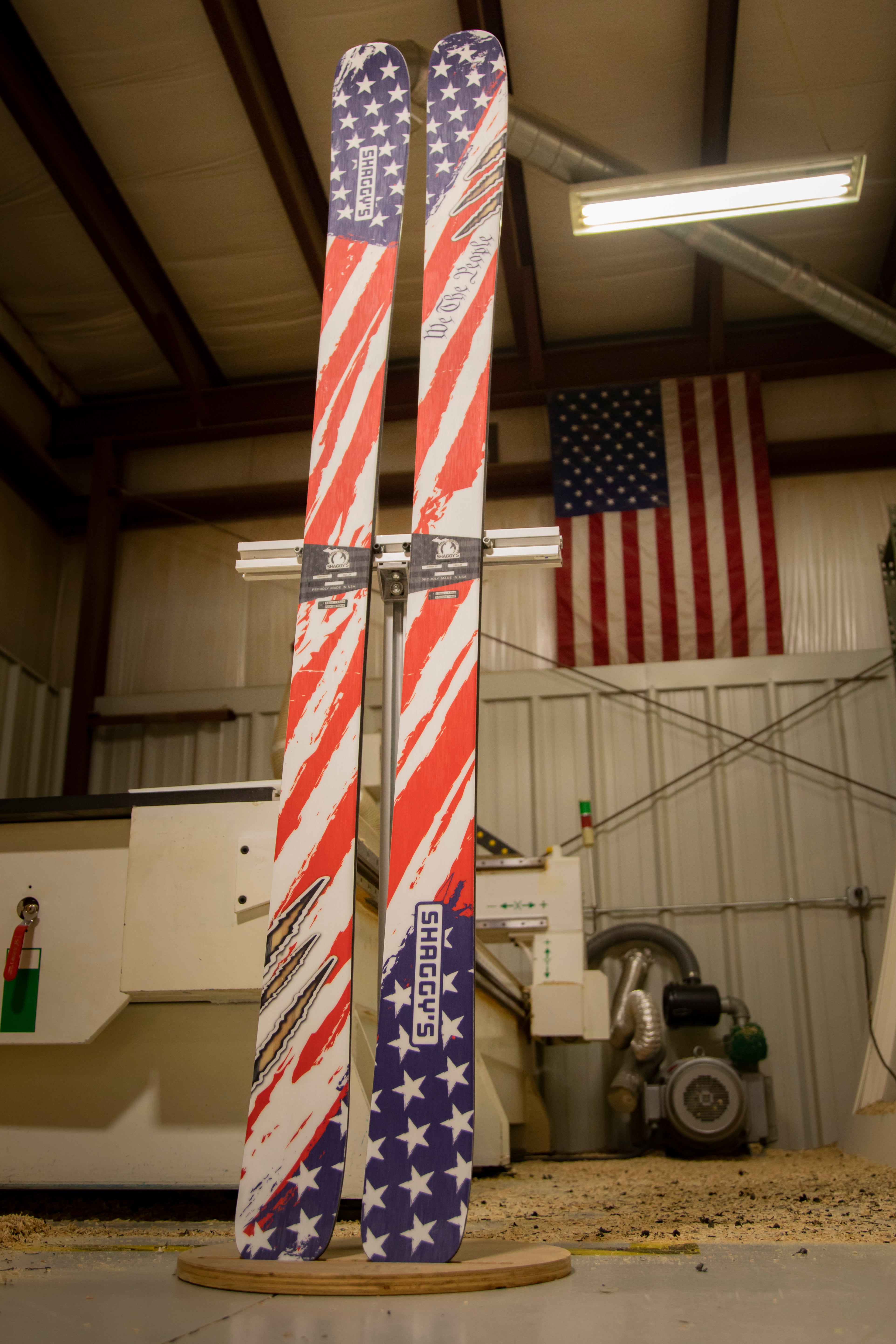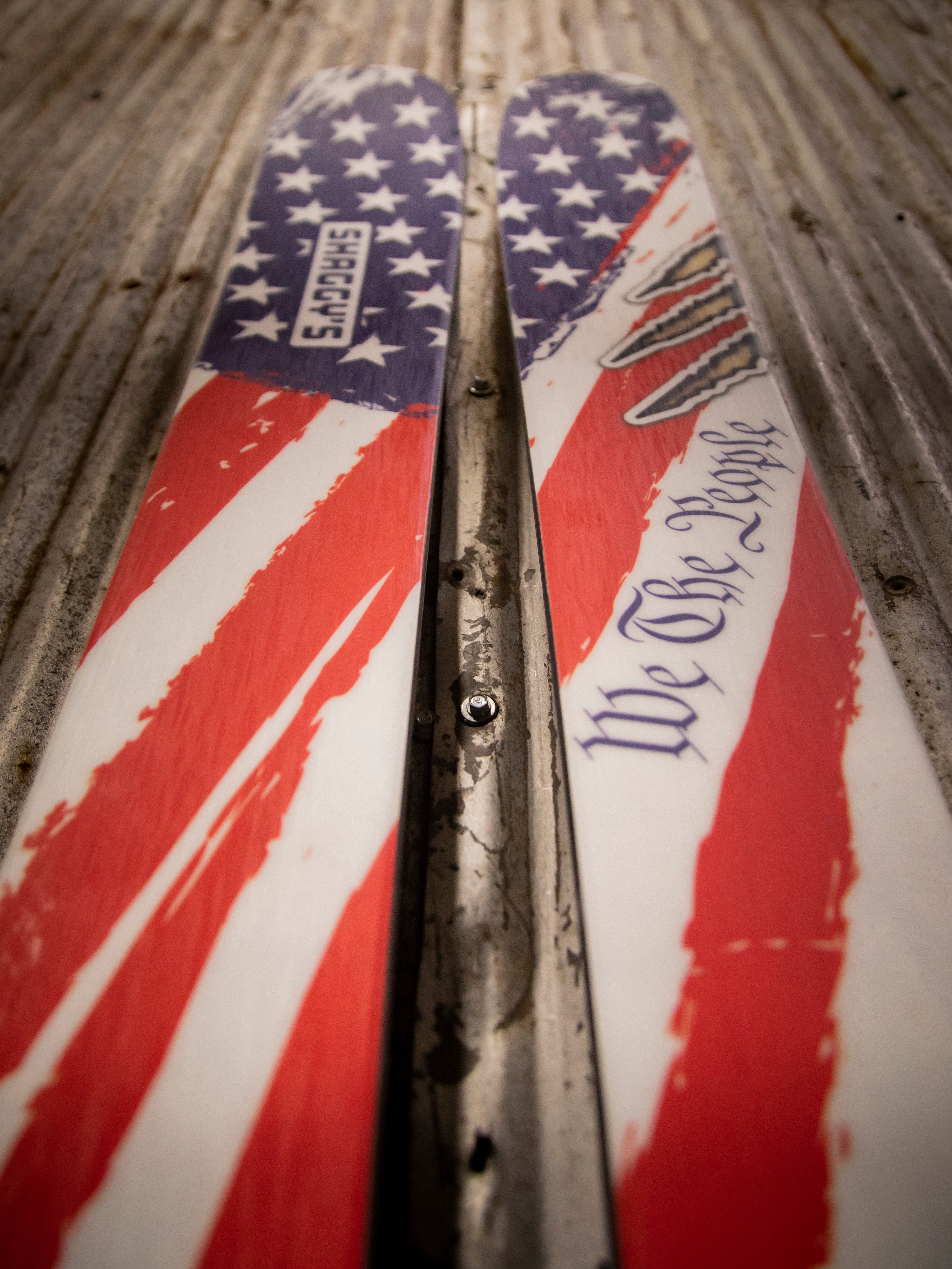 Graphic: Stars and Stripes. Eagle claw marks show the wood core of the ski.