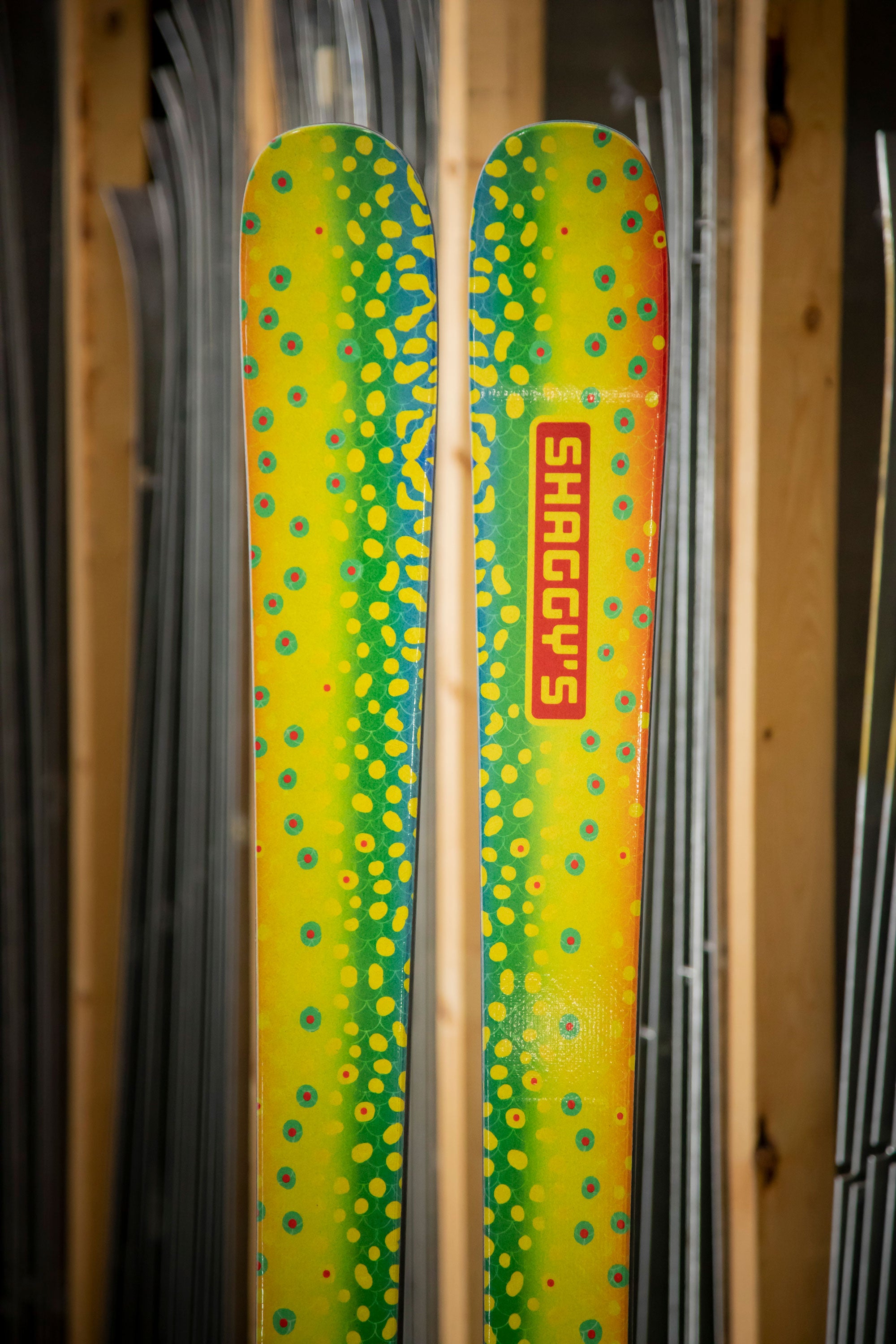 Have you wanted a pair of custom skis to set yourself apart from the rest of the crowd? Here's your opportunity to get your hands on a pair of Shaggy's with a unique look! These skis have a custom graphic and black/blue color swap bases, are already built, and are ready to ship at a moment's notice.