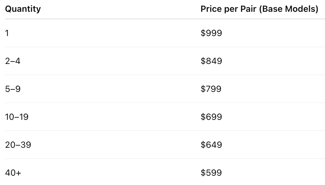 Pricing starts at $999/pair – volume discounts available down to $599/pair (See full pricing below)