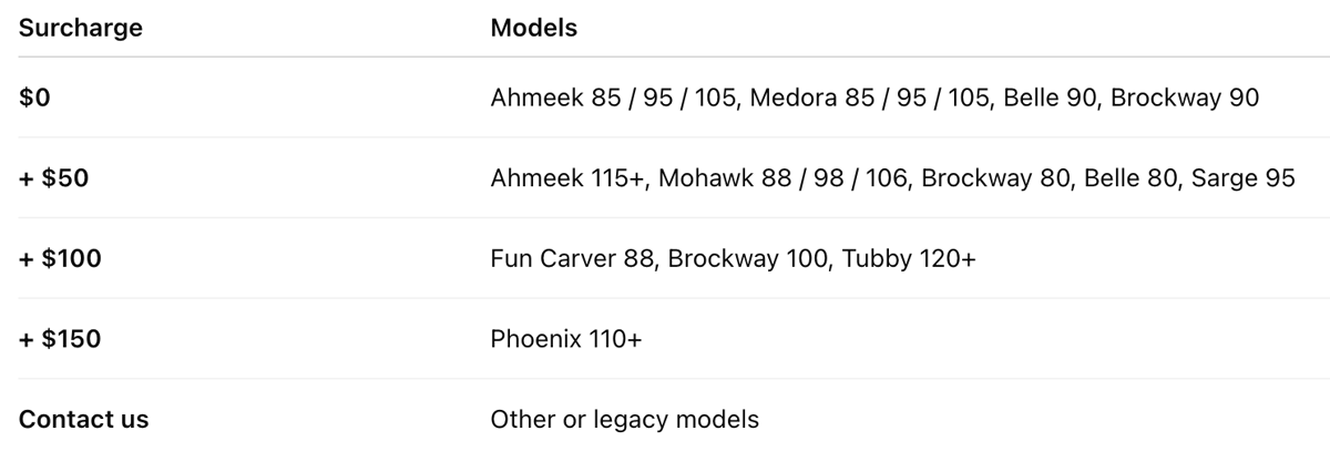 Some skis cost a little more to make — due to materials, shape complexity, or extra steps in production. These surcharges apply per pair.